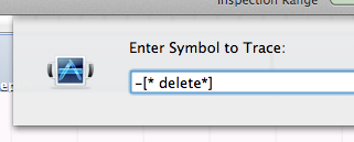 That is, “Trace every ObjC call to any object where the selector starts with the word ‘delete’.” I launched the app and waited for things to quiet down, then tapped in the text field and hit the backspace key on the keyboard. Immediately, a few delete-related methods showed up, including this stack trace:
